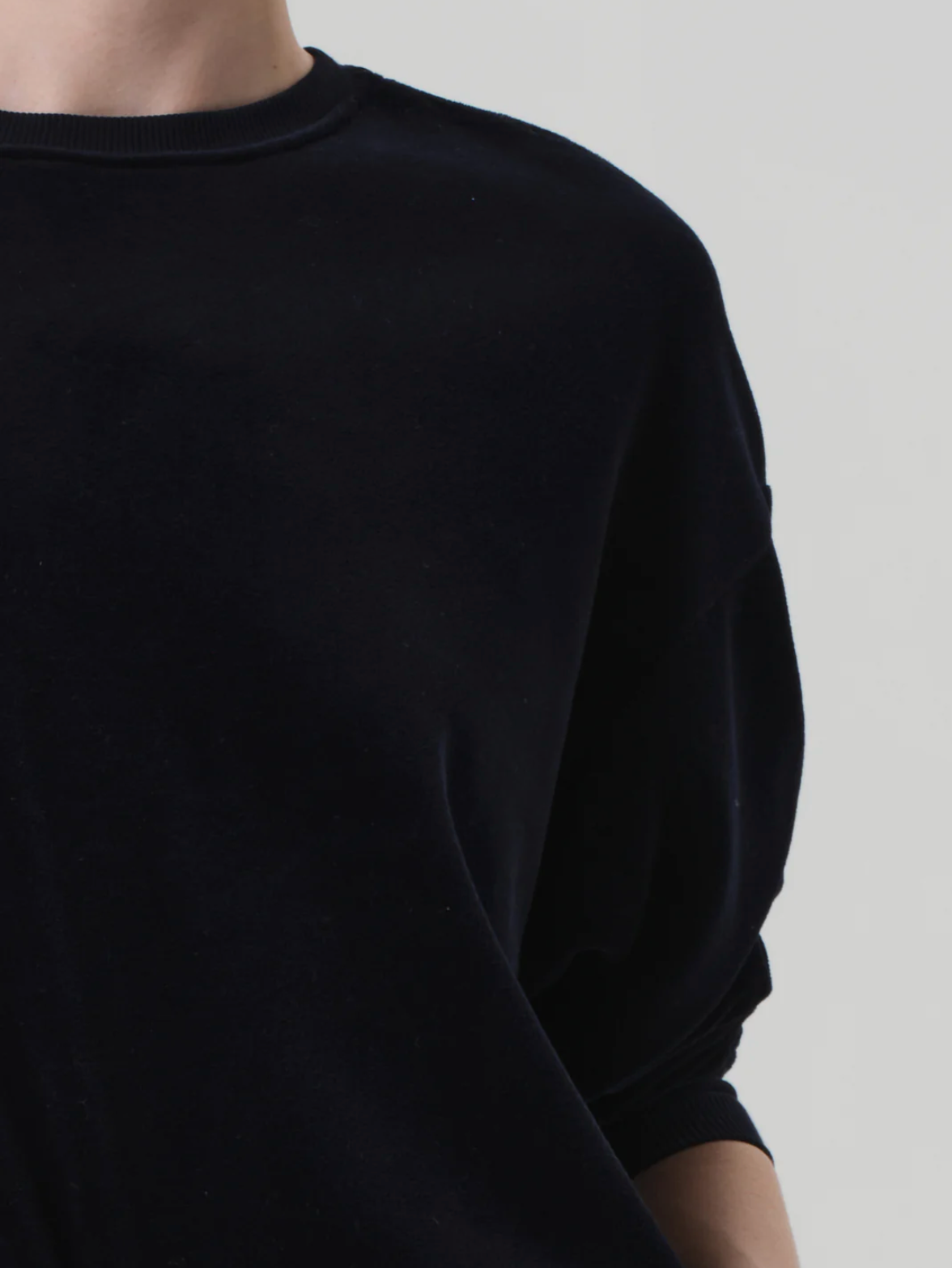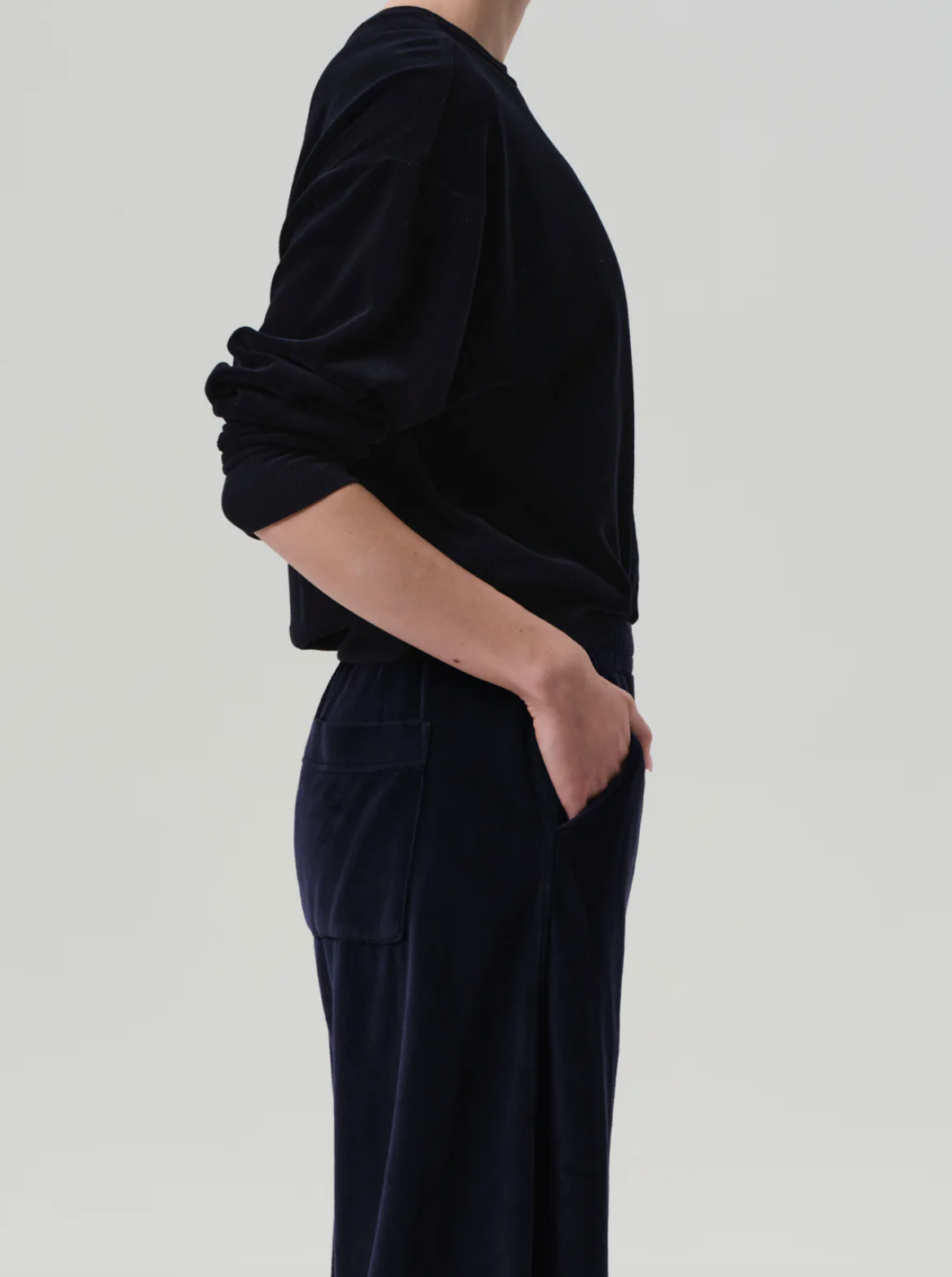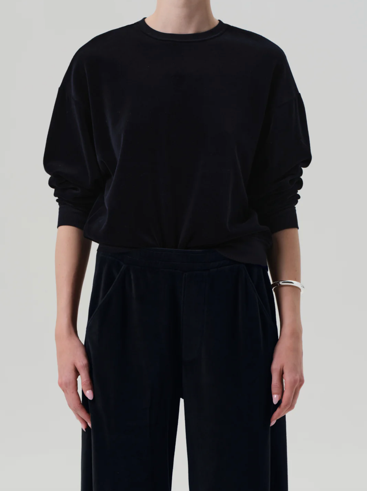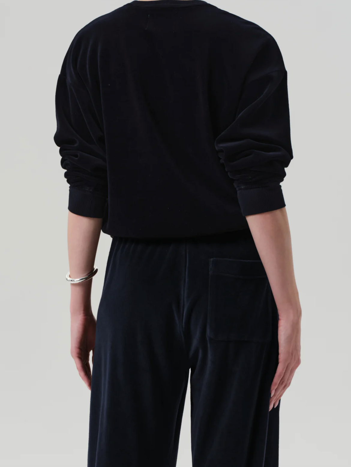 Plush and nostalgic, the Vintage Crewneck is crafted from ultra-soft velour with a subtle sheen and gentle drape. The long sleeve silhouette nods to classic athletic wear, reimagined with a refined touch. An easy layering piece with standout texture—perfect solo or styled under structured outerwear. Very dark navy (looks like black) x