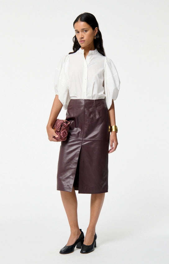 A timeless essential reimagined with modern character, the Felindra skirt brings structure and confidence to the feminine silhouette. Featuring a high waist and clean, straight cut that falls to the knee, it offers a sleek, elongated look. The front slit adds a subtle yet striking detail, allowing for ease of movement and refined allure. Finished with a discreet zip closure at the back, Felindra is a versatile piece designed to transition seamlessly from day to evening.