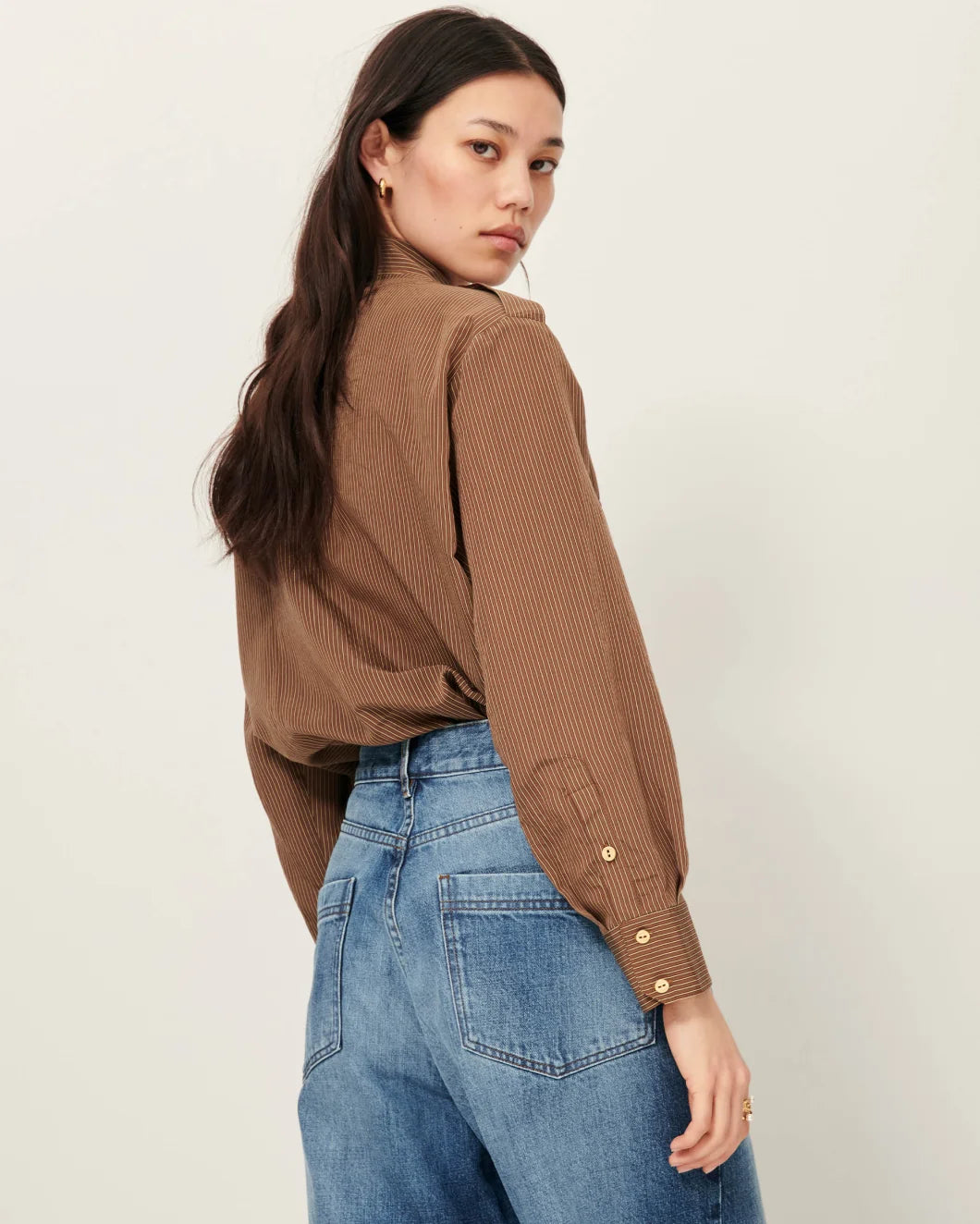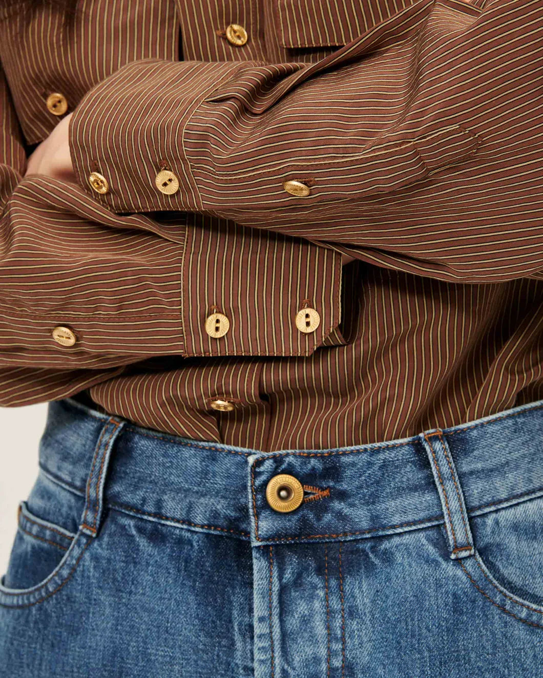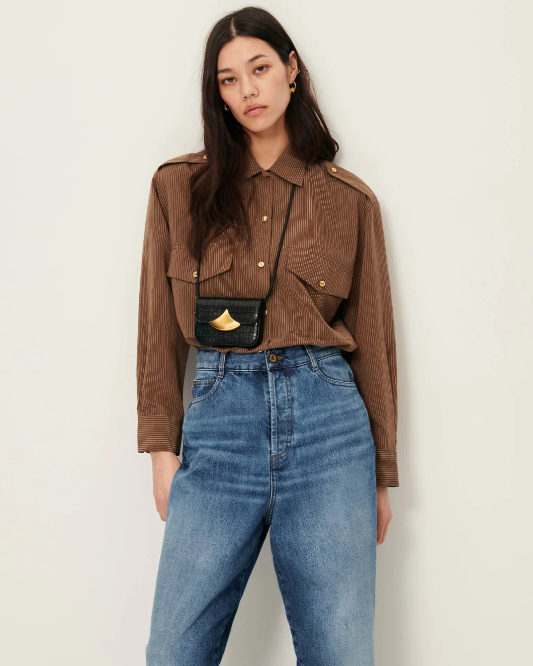 Officer-style shirt with shoulder tabs and patch pockets in soft striped Lyocell poplin, woven in Italy